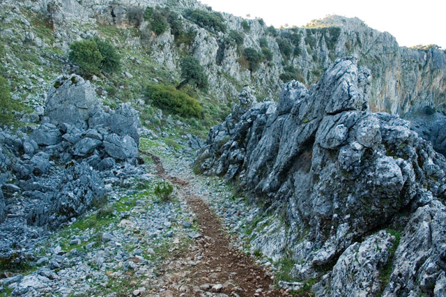 Desde un zona elevada del sendero podemos ver mejor el amplio camino que llevamos, muy bien trazado entre las altas masas de roca.