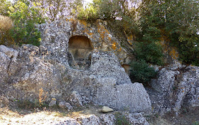 Desde el punto anterior retrocedemos para buscar bancales más inferiores de la ladera donde siguen apareciendo los sepulcros por doquier. Allí donde la roca aflora es fácil localizar uno tras otro los enterramientos, que en este caso y gracias a la verticalidad de la peña, aprovechan para tallar formas hipogéicas.