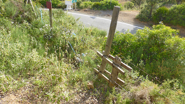 …buscando este saltadero. Podríamos no cruzar la angarilla, no bajar a la carretera y no cruzar el saltadero, pero la vegetación de ese corto tramo (y otra alambrada sin saltadero) lo complicaría más.